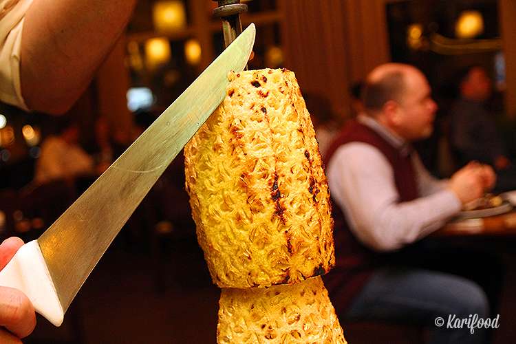 Подсказка вторая: важно всё время держать в уме то, что за вечер к вашему столу официант подойдёт как минимум 14 раз, предлагая и мясо, и закуски, поэтому голодным вы не уйдете в любом случае, и самое вкусное мимо вас не пронесут — все закуски с гриля обязательно попадут к вам на стол: колбаски, телячьи рёбрышки, сочный барашек, нежнейшая пиканья, курица в беконе, кафта, свинина в пармезане, и король стола — запечённый на гриле ананас. Пробуйте всё, но по чуть-чуть — и будет вам счастье!