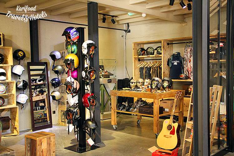 За стеклянной перегородкой — ремонтная мастерская, wait-list в которую расписан на три-четыре месяца вперед, вдоль стены тянется стойка кофе-бара, в углу – магазин-корнер дизайнерский байкерских штук – шлемов, курток, рюкзаков, перчаток.