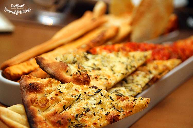 И хлеб, фантастический итальянский хлеб, перед которым зашатаются любые, даже самые твёрдые принципы здорового питания, строго-настрого исключающие мучное! На столе возникают две корзины с сардинским тонким хлебом карассао, тонкой фокаччей с розмарином и чесноком, которая сводит с ума своим ароматом, лепёшки с томатной пастой.