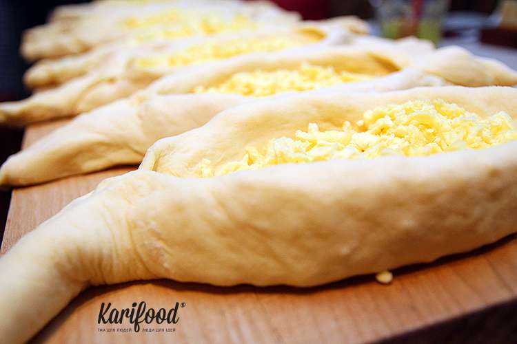 Начинку из яйца, сыра и сливочного масла следует перемешать прямо в «лодочке», а затем отламывать бортики, макая их в горячую сырно-яичную массу и осваивая навык правильного поедания аджарского хачапури — никаких вилок, только руками!