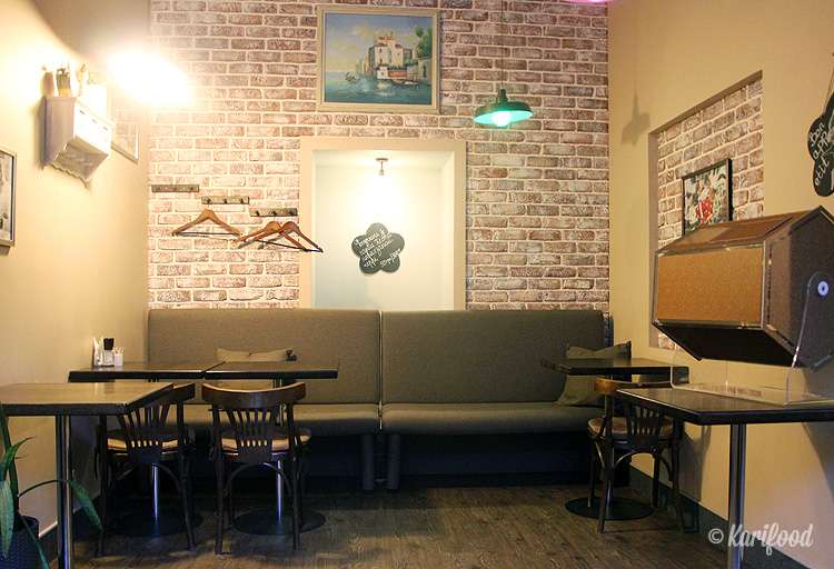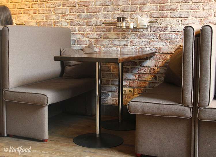 Если это попытка воссоздать дизайн настоящей итальянской пиццерии, где простота граничит с аскетизмом — то к чему тогда эта россыпь банок с макаронами и пёстрыми картинками? И эти совершенно неудобные диваны и их расположение по принципу вагончика или кафетерия с содовой в духе американского ретро — это совершенно точно не Италия. Италия — это плотно стоящие столики вдоль стен и в центре зала, когда посетители в буквальном смысле соприкасаются локтями, а не сидят, отгородившись друг от друга высокими спинками диванов. Не нужно бояться тесноты, которое создаёт обилие столиков — именно эта теснота и является главным признаком хорошего семейного ресторана, а не банки с оливками и каперсами на подоконниках.