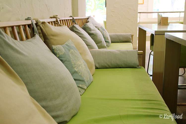 Можно присесть в зеленоё плюшевое кресло у окна, можно отыскать скрытый от посторонних глаз столик за колонной, можно расположиться на длинном диване с разноцветными подушками и или в плетеных черных креслах, навевающих мысли об океане и белом песке.