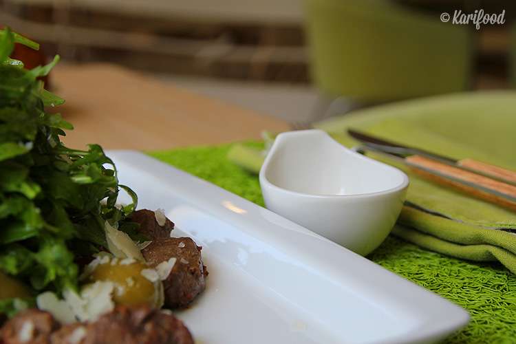 Порция зелени оказалась не по-ресторанному щедрой, маленькие помидоры сладкими-сладкими, оливки пряными, телятина нежной и сочной, а соус лишь оттенял ароматы и вкусы, не перегружая салат своим присутствием!..