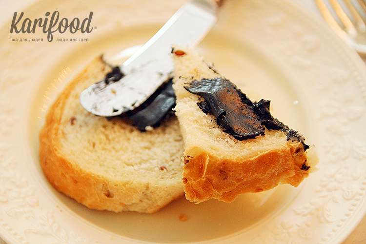К салату хорошо идут тосты с чёрным маслом. Масло подкрашенно чернилами каракатицы и пахнет морем — почти что экспресс-вояж по атлантическому побережью Испании.
