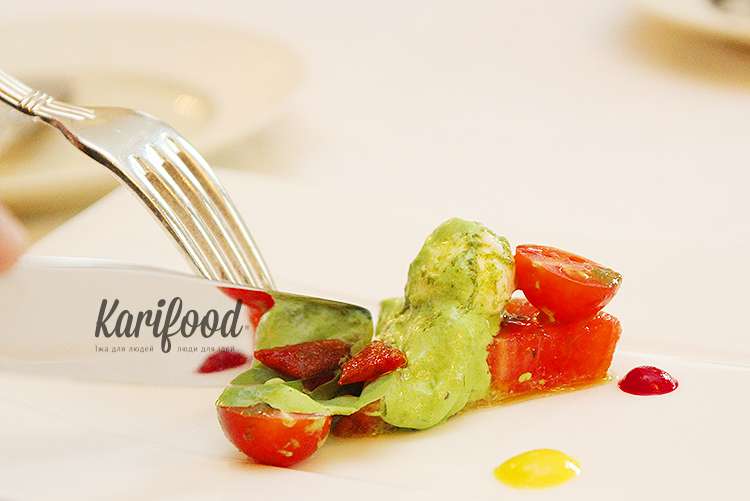 Тему овощных освежающих закусок с готовностью поддерживает сочный, почти что сахарный томат «бычье сердце» с моцареллой, зелёным песто, с помидорами черри и эспумой свежего шпината. Дачный вариант подобного салат выглядит примерно так: в одной руке у вас гигантский красный помидор, в другой — другой такой же, и весь подбородок по локоть и по колено в томатном соке.