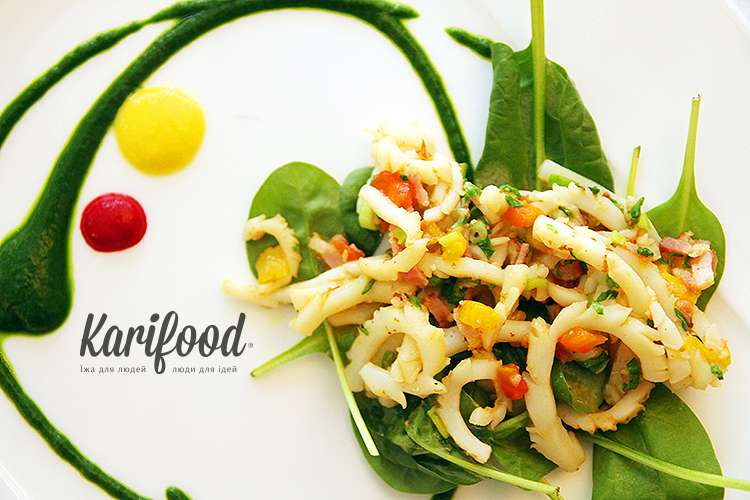 Стефан гостеприимно распахивает двери и для сытного сочетания бекона с нежным кальмаром, и для супа из свежих огурцов и сыра филадельфия, и для сладких украинских томатов «бычье сердце» под одеялом из воздушной шпинатной эспумы.