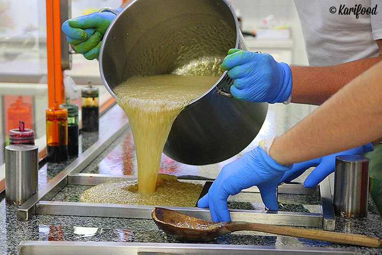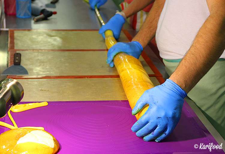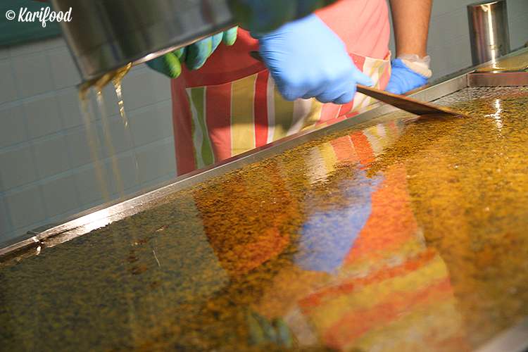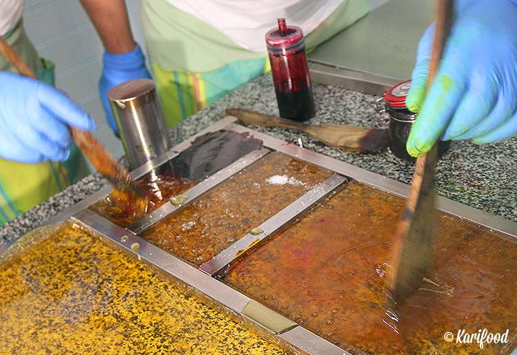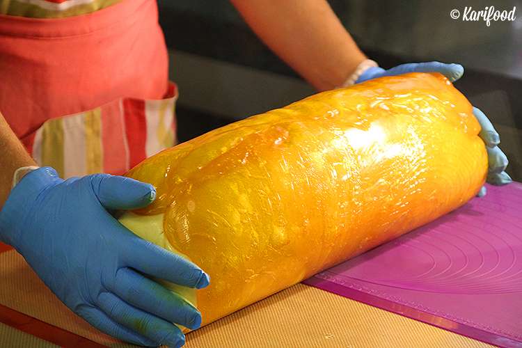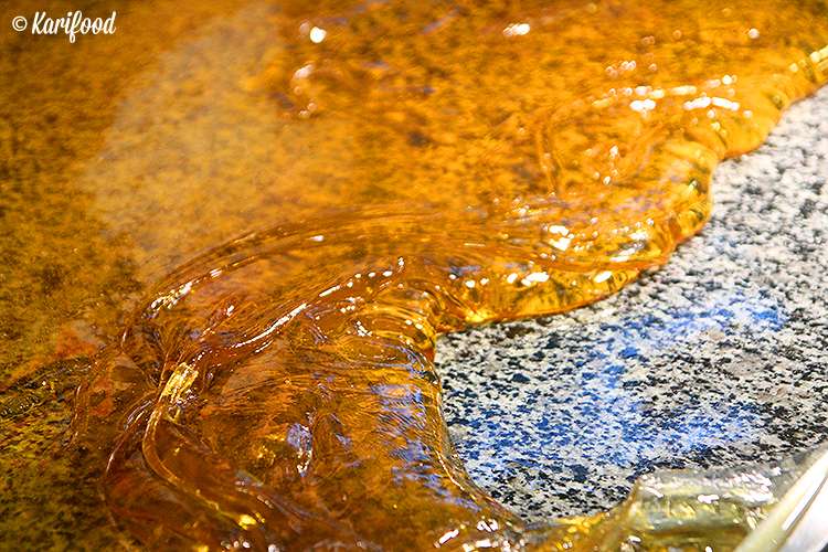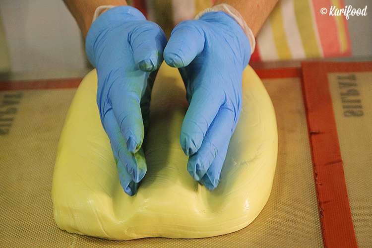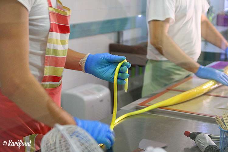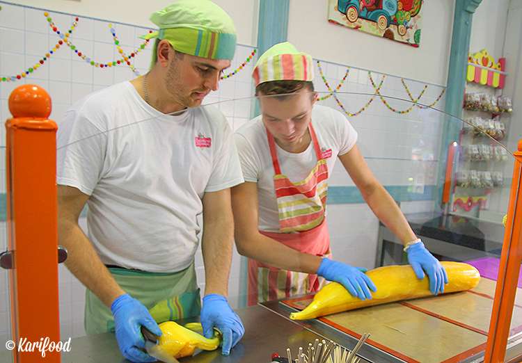 Работать с горячей карамельной массой нужно аккуратно и очень быстро — остывая, она стремительно начинает терять пластичность. На ваших глазах в карамель добавляют натуральные красители и ароматизаторы, замешивают, раскатывают, вытягивают на специальном крючке плотные, точно девичьи косы, карамельные канаты — чтобы в ней не осталось пузырьков воздуха, лепят огромный плотный валик с узорчатой фактурой внутри.