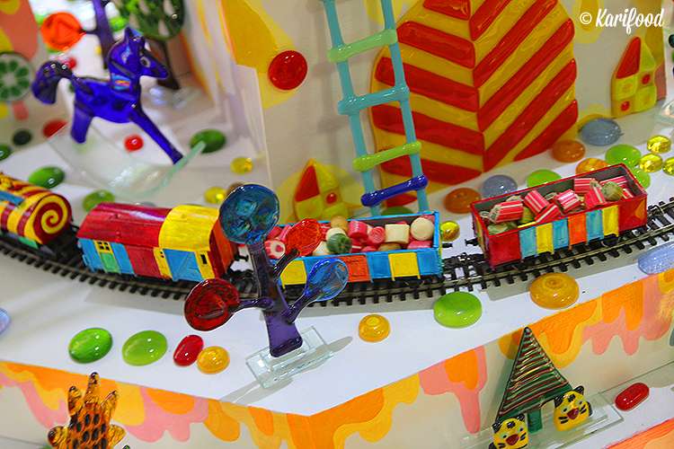 Праздничный разноцветный замок из гладких, точно леденцы, стеклышек, глядящий на Киев из витринного окна «Майстерні Карамелі» — это дверь в миниатюрный праздник детства и конфетного счастья. Стоит задержаться возле витрины — и уже через мгновение ловишь себя на улыбке! Замок с башенками, по которому прогуливаются лиловые зайцы, желтые котята, бородатые князья, красные лисицы, а по кругу катается паровозик, вагоны которого до верху загружены карамельками разгоняют тучи на самом хмуром и грустном лице. Думаю, главная заслуга в этом лилового зайца, он в самом деле очень мил!
