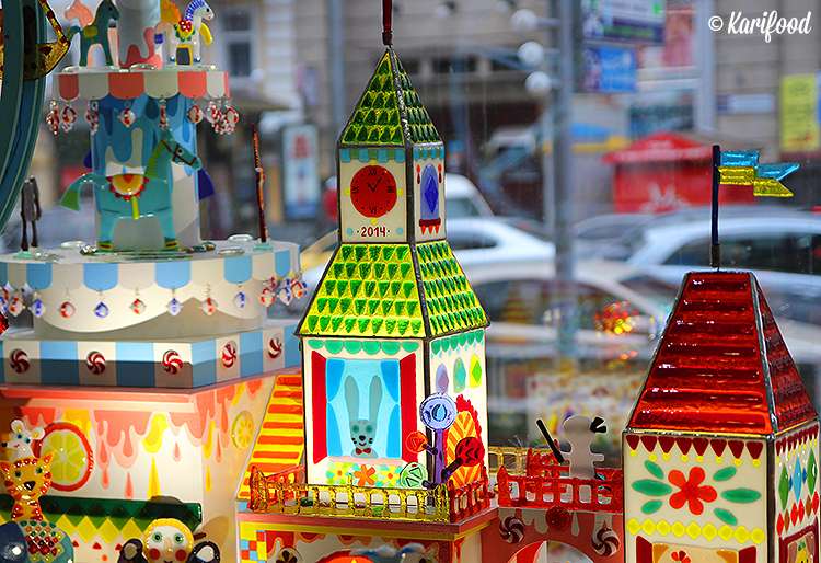 С этими стеклянными фигурками зайцев и мишек часто выходит забавная история, как рассказывают в «Майстерне«: налюбовавшись на витрину, люди заходят внутрь и просят: «Нам, пожалуйста, таких зверушек по несколько штук заверните!» Приходится объяснять, что красочное великолепие в витрине сделано не из конфет, а стараниями молодых львовских художников, работающих со стеклянной скульптурой. Выполнен замок настолько мастерски, что хочется прилипнуть носом к витринному окну и, тыча пальцем в паровозик с карамельками, радостно восклицать: «Смотри, смотри, там конфеты!»