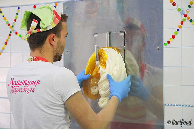 Вся продукция «Майстерні Карамелі» создается прямо на глазах у посетителей. Начиная с 10 утра каждые два часа мастера выносят в зал чаны с кипящей сахарной массой и выливают ее на специально подготовленный для работы с карамелью стол. От гостей и зрителей эти столы отгорожены стеклянными перегородками, чтобы чересчур любопытные носы не обожглись расплавленным кипящим сахаром и патокой, температура которых в этот момент превышает 100 градусов.