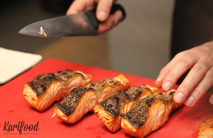 Лосось, предварительно замаринованный в якитори-маринаде, обжаривается на «робате», сверху глазируется соусом терияки, вкус которого на тарелке точно так же балансирует свежий огурец.