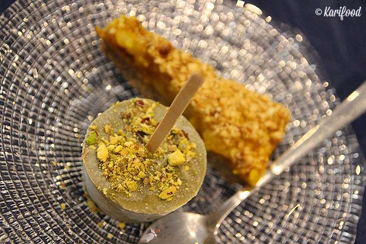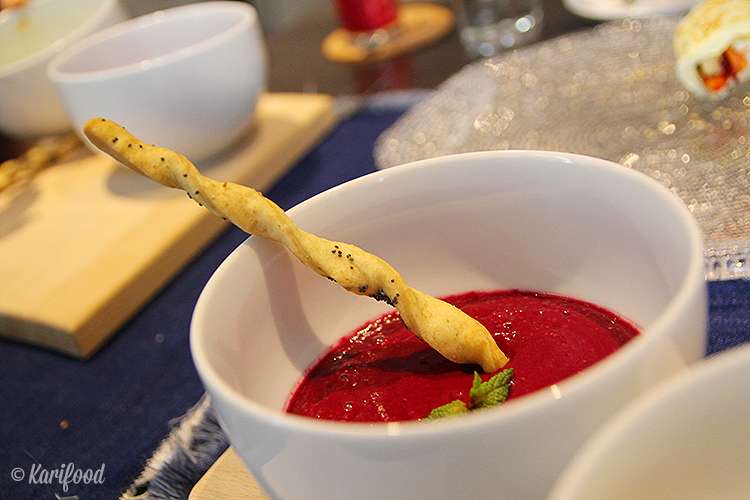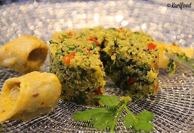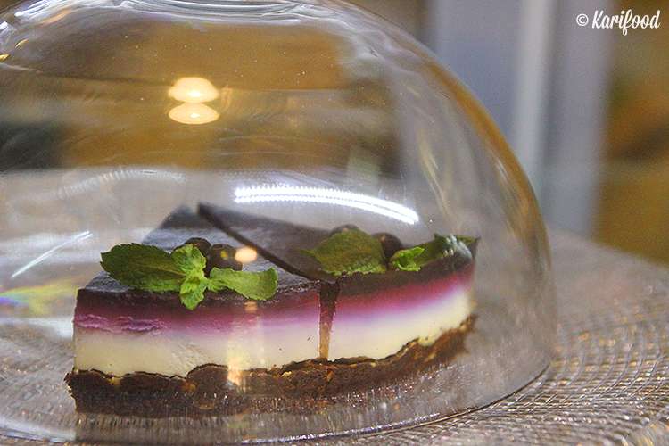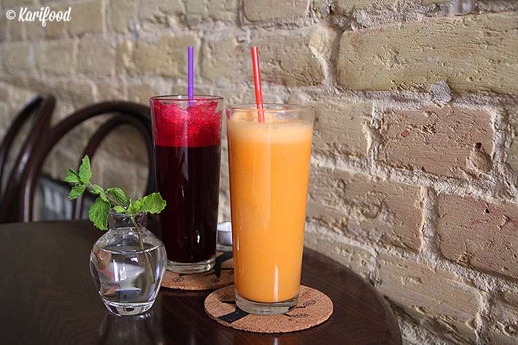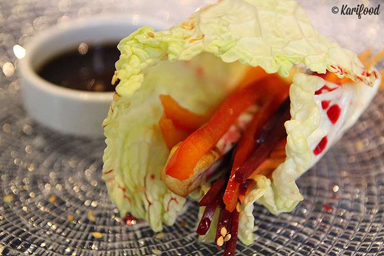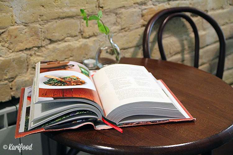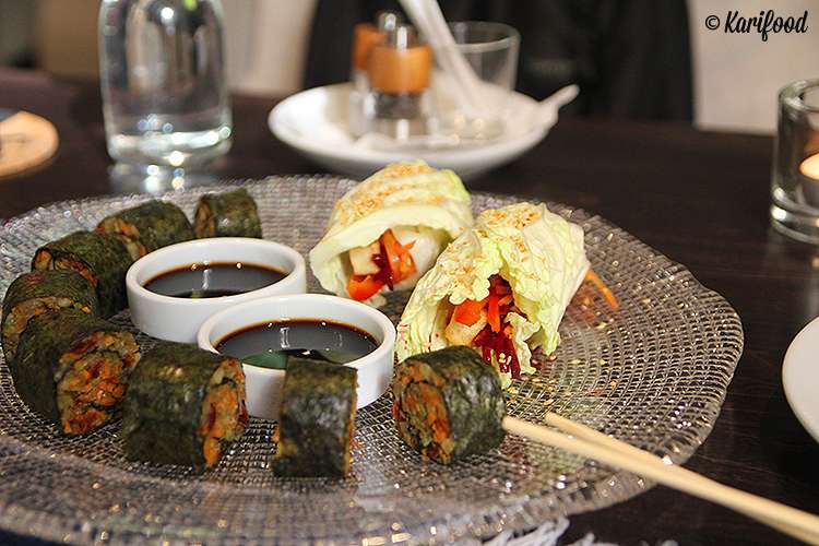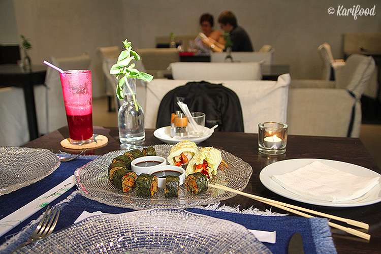 Восточный салат, который подаётся в листе савойской капусты с молодой свеклой и пряным тофу, затем ролл с сезонными овощами в нории, затем по две порции супа – raw-суп из сырой свеклы, авокадо и мяты и нежный минестроне с веганским песто – к супу ещё приносят хрустящие зерновые палочки грессини с маком. Главное блюдо представляет собой солидную порцию киноа с зернами горчицы и равиоли со шпинатом и вялеными томатами. А на десерт очень вкусное мороженое из кокосового молока с ревенем и фисташками и яблочный пирог.
