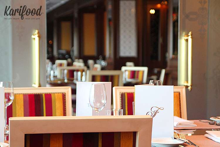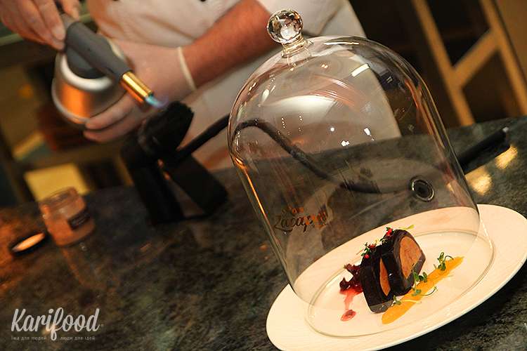 Каждое новое блюдо обеденной карты — небольшое шоу с дымком, огнём, весеними красками, шоколадными сферами и ёмкими концептуальными подачами. К примеру, подкопчённую гусиную печень в желе из мадеры и клюквенным конфи, протомлёным в коньяке, подают в облаке дыма под стеклянным колпаком.