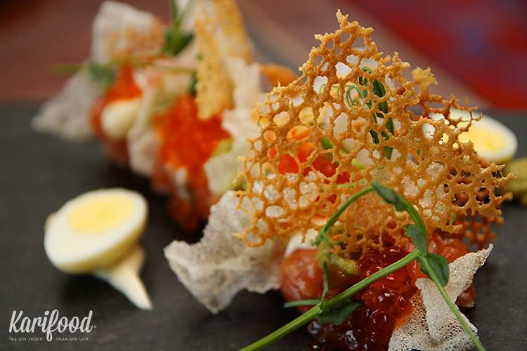 Тартар из лосося — одна из самых популярных закусок в меню ресторана — в новой интерпретации обросла поджаренными ажурными чипасми из рисовой бумаги и подается с трюфельным айоли, гуакамоле из авокдо и микрогрином гороха.