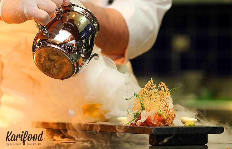 Выносят в зал его с бокалом сухого льда, который опутывает тар-тар лёгким белым облаком.