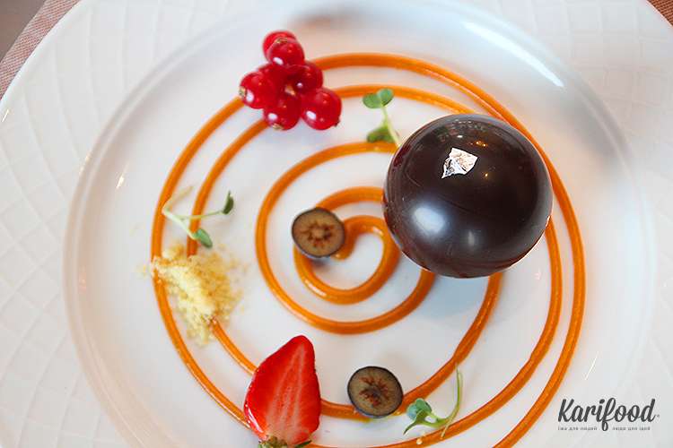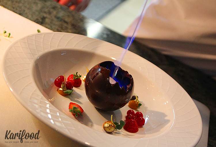 Шоколадная сфера «Романофф», украшеная пищевым золотом и красными ягодами, — зрелищная услада для глаз. Подают её, поливая сверху «горящим» ликёром Cointreau, шоколадный шар фактурно оседает и плавится, обнажая сердцевину из мороженого, бальзамического уксуса и свежей клубники.