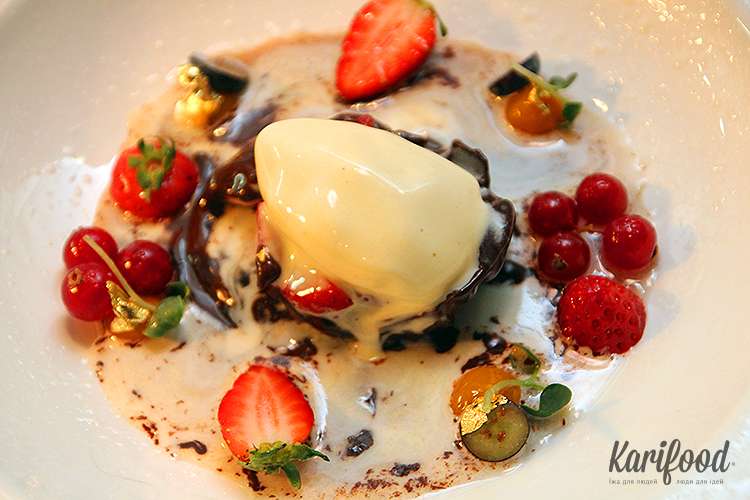 Шоколад, настоящее ванильное мороженое, но совершенно тепличная, чуть кислая, клубника и такие же безвкусные пара ягод смородины — клубника в январе эпатажна, а вот в марте слишком декоративна и не очень вкусна.