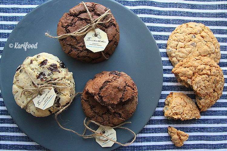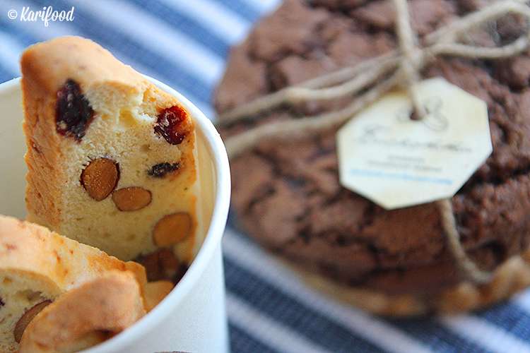 Сейчас в ассортименте Biscotti несколько видов печенья, ромовое с клюквой и банановое с овсянкой. Есть ещё шоколадное с апельсиновой цедрой и перцем, есть печенье с вишней и корицей — каждое из них размером с ладонь, таким очень удобно накрывать чашку с горячим чаем, молоком или какао, кладя печенье сверху, будто крышку. И, конечно же, маленькие хрустящие бискотти с орешками, которые можно прихватить с собой, отправляясь на прогулку, или дополнить ими утреннюю чашку кофе.