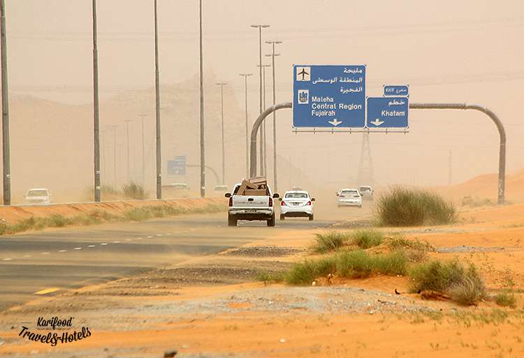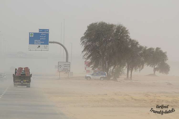 Песчаные бури в городе (их сезон в ОАЭ попадает на февраль-март) довольно неприятны, микроскопическая пыль, ветром надуваемая из пустынь, висит над городами сероватым туманом, покрывает лицо «колючей» пудрой, в пустыне же интенсивный ветер способен менять ландшафт, сглаживая барханы и создавая новые.