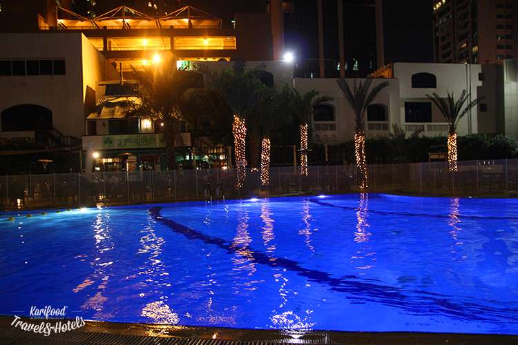 Но зато бассейн в Al Ain Palace окружён частоколом небоскрёбов, которые ночью заливают всё небо над головой яркими огнями — волшебно проводить в таком бассейне вечера!