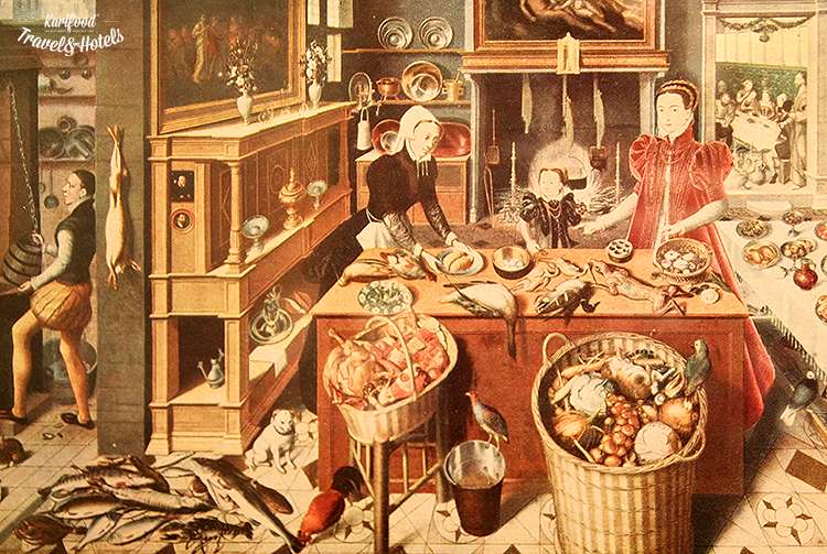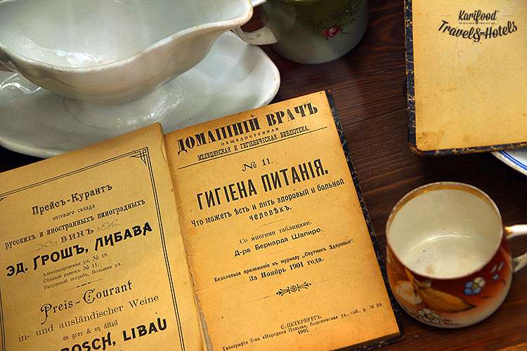 Сервизы, мебель, кухонные приборы от старинных маслобоен и кофемолок до современных консервных ножей, меню, кулинарные книги, дворцовая посуда и советские «типовые» сервизы — как тот графинчик в виде рыбы с рюмочками-рыбками.