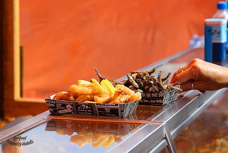 На всіх ятках з їжею торговці щільно запаковують паперові коробочки з підсмаженою дрібною рибкою, кільцями кальмарів, шматочками лосося чи печеною картоплею і замотують у фольгу.