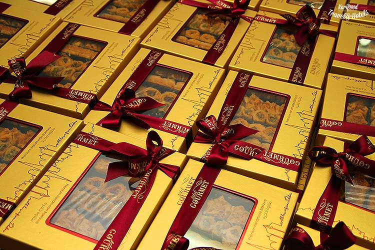 То есть, сюда в одну дверь заходят орехи, финики, шафран, кардамон, бельгийский шоколад, мука, сахар, из другой они уже покидают ВМВ в виде готовых коробок со сладостями, печеньем, баклавой, конфетами. Отсюда драгоценные коробочки разъезжаются по всему миру — сегодня их экспортируют в 15 стран.