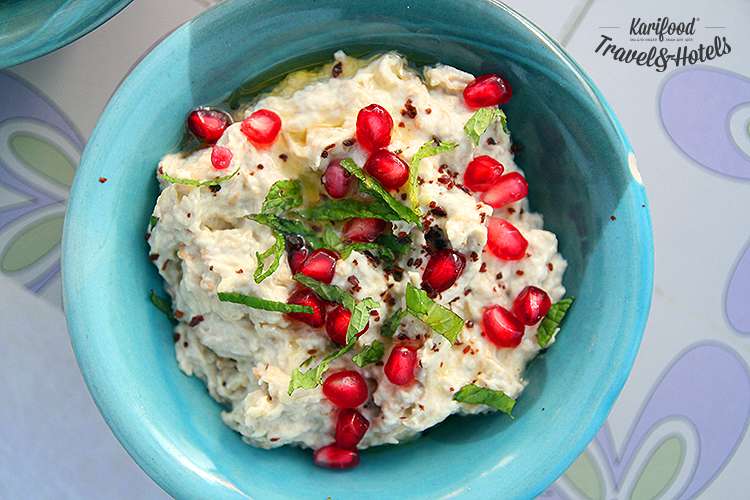 Щедрой рукой накладывайте на тарелку хумусы с оливковым маслом, свежие овощи и зелень, мутабаль из печёных баклажанов с лёгким ароматом «дымка» под горстью рубиновых зёрен граната.