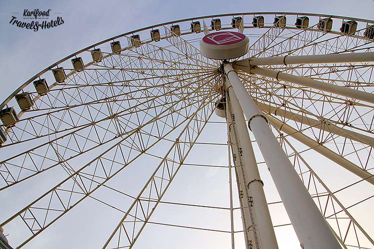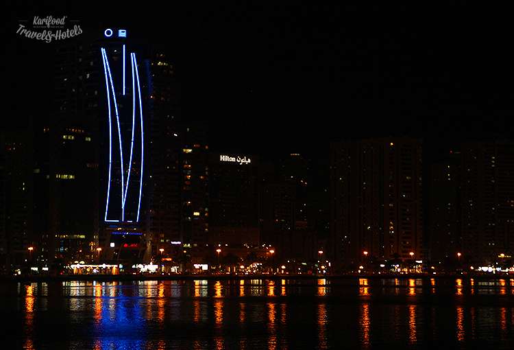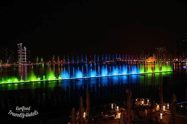 Над Al Qasba сияет колесо обозрения, в лагуне возле парка Al Majaz, едва стемнеет, включаются светомузыкальный фонтан.