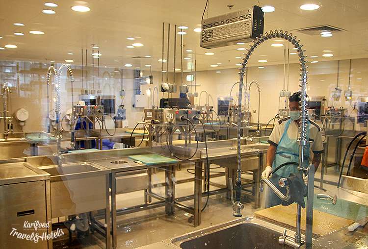 Разделочный цех находится отдельно, он ограждён плотными стеклянными перегородками от торгового зала, и точно так же может похвалиться стерильной чистотой.