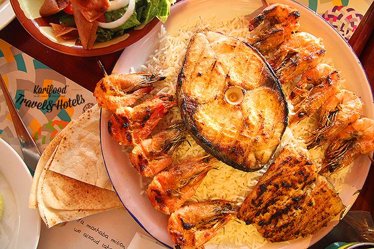 Плато рыбы и морепродуктов на рисе — сытная альтернатива роскошным кебабам, ливанским котлеткам кеббе и шашлычкам в лаваше с печёными овощами.