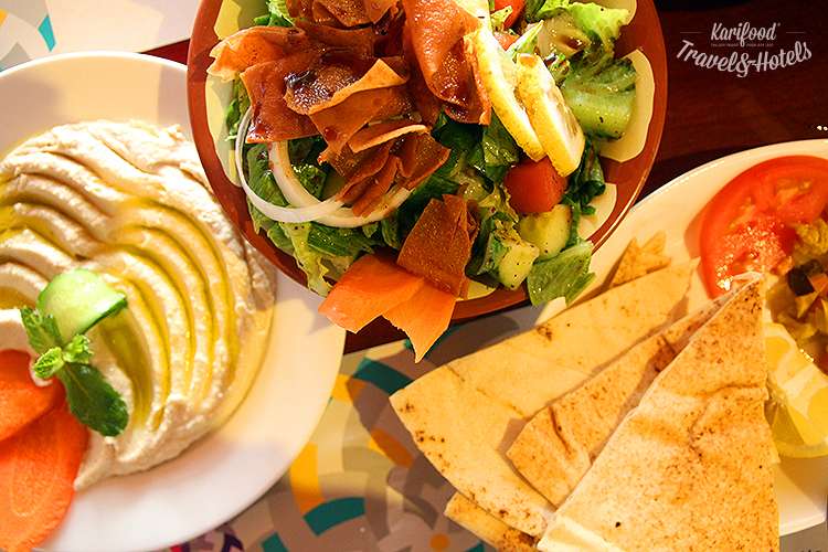 Зато здесь подают вкуснейший хумус и мутабаль с кубусами — шарообразными лепёшками с куркумой, отличное мясо, самсу, фаляфель и кеббе, оливки, острые и пряные пасты.