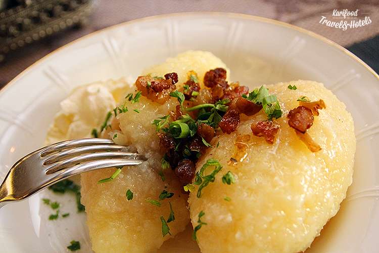 Кстати, о цеппелинах. В двух словах: это внушительных размеров картофельные клёцки, которые готовят из смеси тёртого сырого и вареного картофеля и начиняют мясом, сыром, грибами, поливают сметаной, а сверху посыпают поджаренным салом.