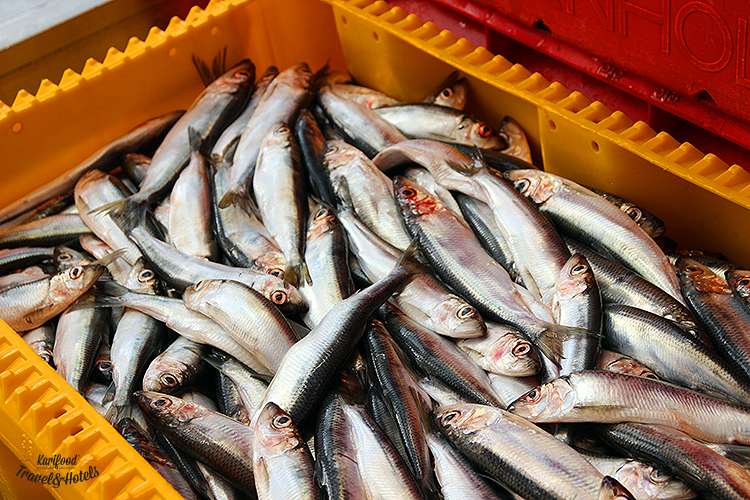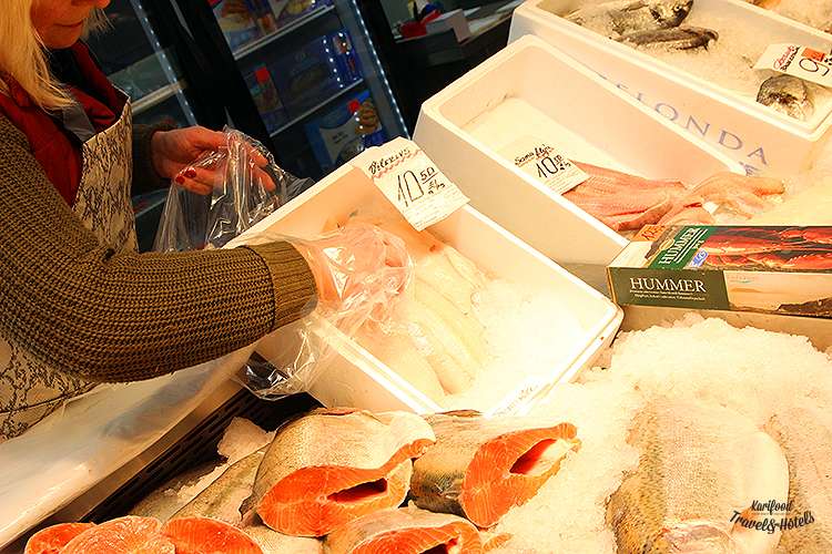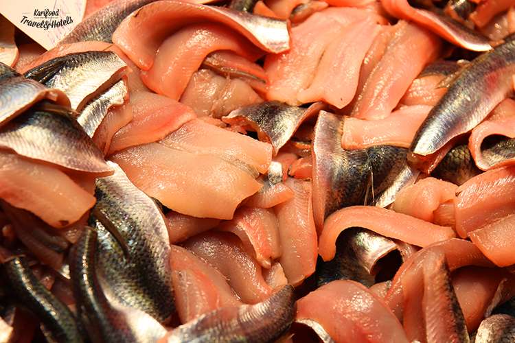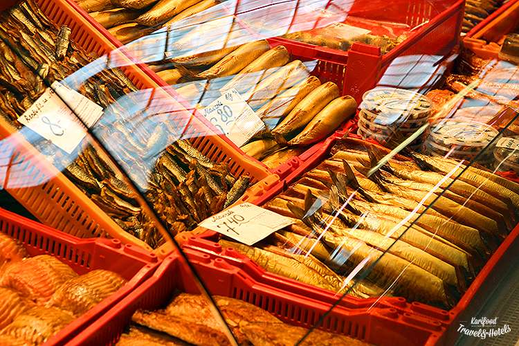 Близость Балтийского моря, конечно же, определяет ассортимент ледников на витрине: угорь (один из главных местных специалитетов), салака — та самая рыба для шпрот, камбала, бельдюга, ёршики, форель, карпы, сельдь, корюшка, фермерская рыба и креветки и много, много рядов со шпротами, копчёной сельдью, рыбными копчёными колбасками. В общем, помните золотое правило: никогда не приходи на рынок голодным.