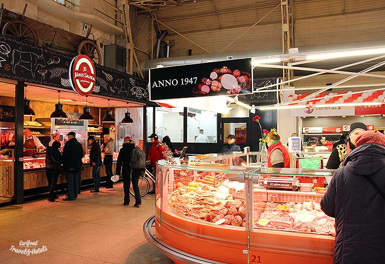 В мясных рядах огромное количество субпродуктов. Здесь продают всё: от телячьих голов, кровяных колбас до ушей, диафрагм, языков и хвостов. Латыши правильно и очень ответственно подходят к использованию туши от носа до кончика хвоста.