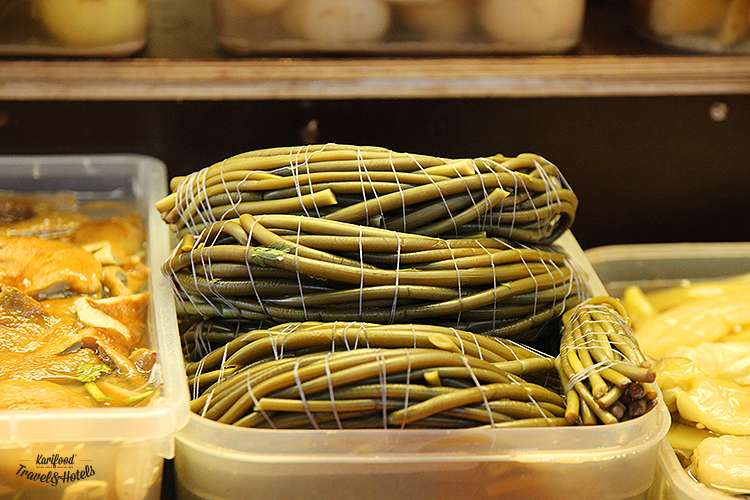 В овощных рядах обратите внимание на уголок с квашениями — бочки с капустой, черемша, чеснок, лук, свекла и огурцы, томаты и репа.