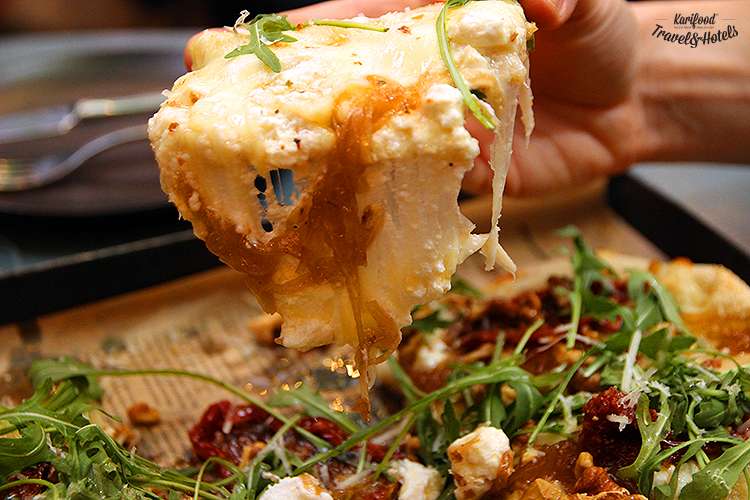 Вегетаріанська піца з в’яленими томатами, сиром, цибулиним джемом та горішками — це щось за межами уяви! Яскрава, насичена, з сиром, що тягнеться від столу до флюгера на соборі Святого Петра, з жирними соковитими томатами, хрусткою рукколою на пропеченому коржику — концентрат чистої любові.