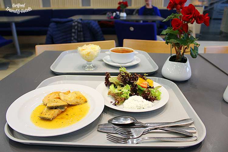 Салати, кілька видів перших та других страв (овочі, м’ясо, риба, гарнір на вибір, десерти, випічка, трошки тістечок, чай і кава з автомату) — просто і смачно як на свою ціну.