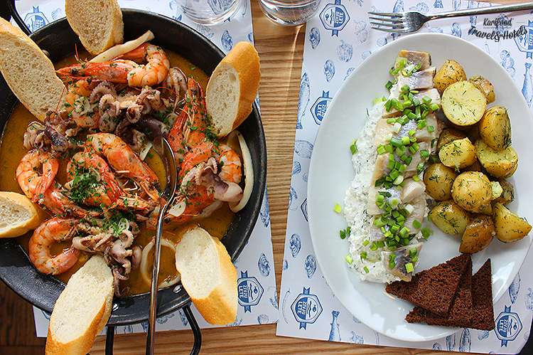 Поки ви чекаєте замовлення, офіціант приносить кілька скибочок хлібу і скляний слоїк із намазкою з тунця і каперсів. І вже в цей момент ви розумієте, яка смакота на вас чекатиме далі! Мої фаворити: салаки, обсмажені в хлібних крихтах з кедровими горішками, до яких подають домашній майонез з каперсами, бутерброди з оселедцем на житньому хлібі, оселедець із картоплею та домашнім сиром, а ще розкішне соте з морепродуктів (склад якого ви обираєте самі на вагу за меню) із запашним хлібчиком.