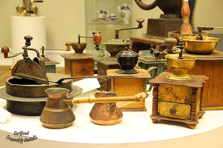 Роскошный египетский дворцовый нагреватель песка для джезв, ростеры, джебены, кофейные чашечки, «языки» для проверки качества кофейного зерна, книги о кофе, сита для калибровки кофейных зерен, кофемолки от первых ручных домашнего использования до самых модных электрических, походные кофеварки времён первой мировой войны, целая экспозиция старинных кофейных банок и даже уникальная мерная чашка «для 60 зерен» Бетховена!