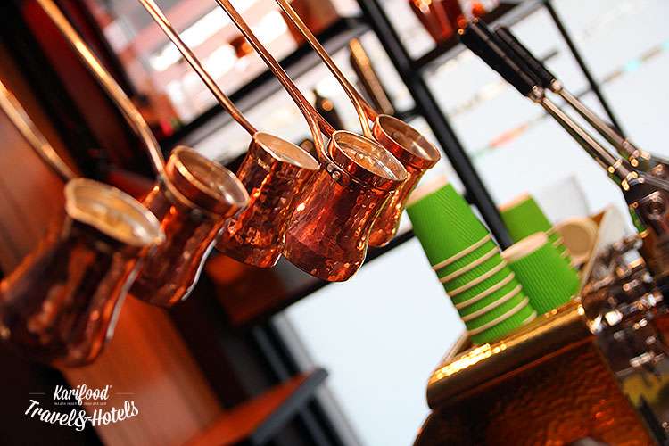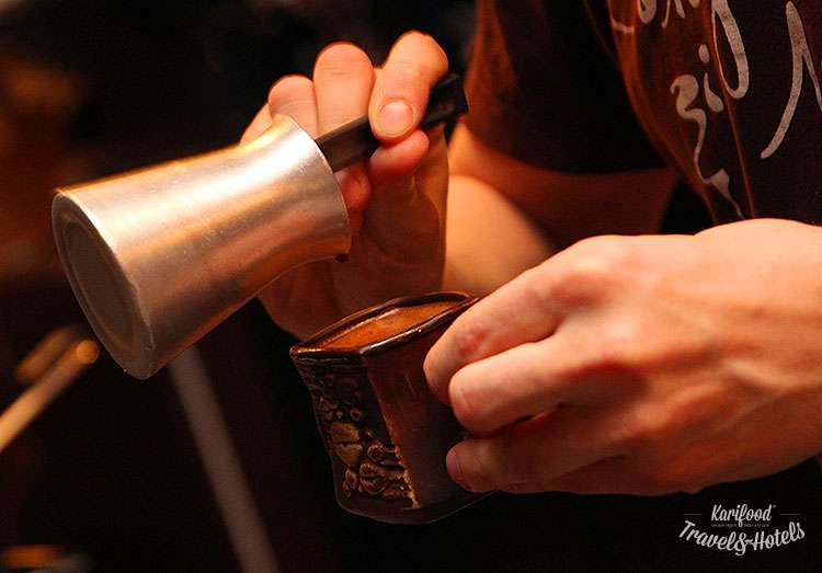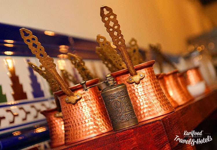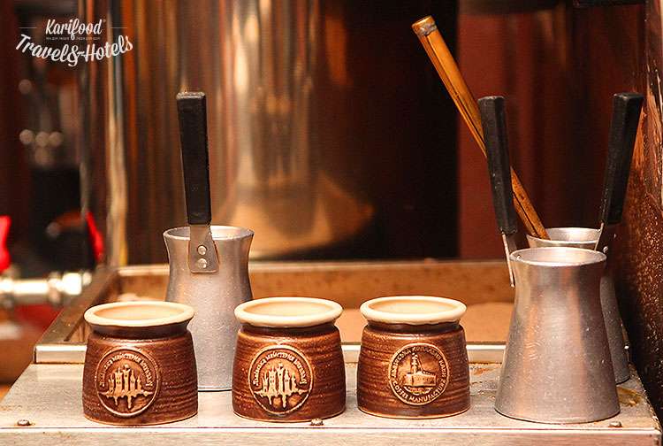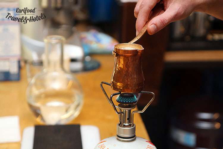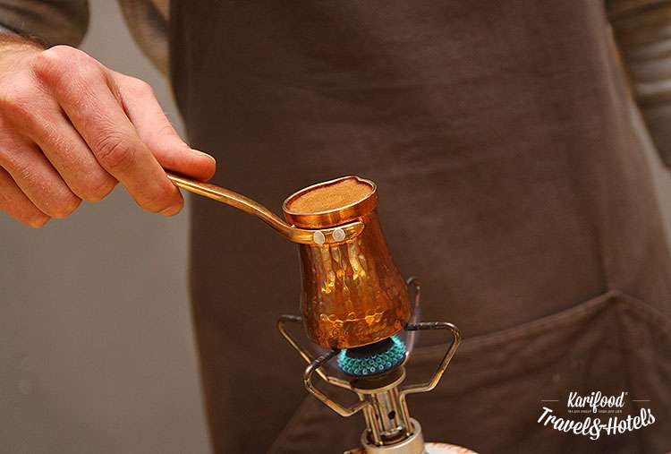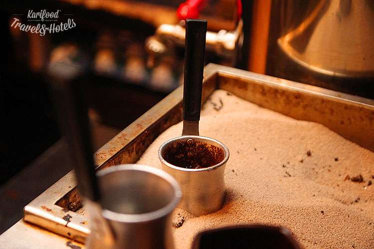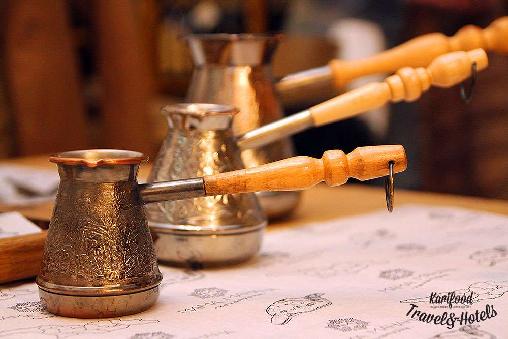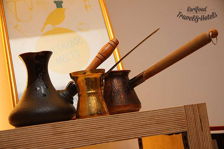 Ресторан крымско-татарской кухни Мusafir придерживается исключительно олдскульного способа приготовления кофе — по-восточному на песке. Кофе-машины в заведении вообще нет, зато есть нагреватель для песка и целая полка с джезвами, специями и пряностями.