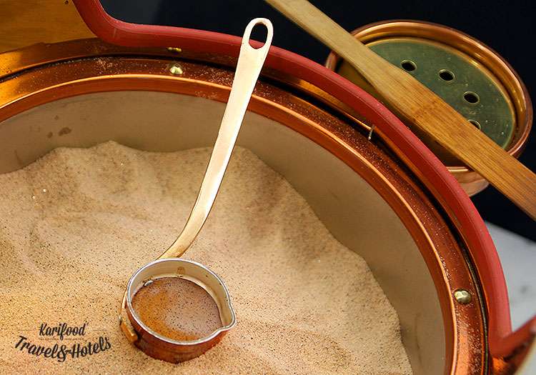 По его словам, такой кофе не нужно ничем «приукрашать»: «Мы имеем кофе, который нужно ценить за кофе, это не дешёвый кофе с пустотным профилем, для вкуса которого надо добавлять и сахар, и масло, и пряности, и сироп». Как дань восточному происхождению кофе на песке, в меню к нему рекомендуют медовые сладости — пахлаву с орехами.