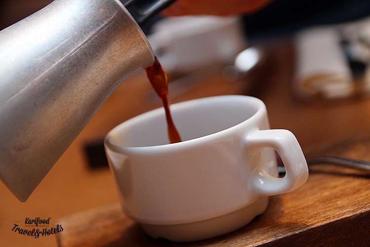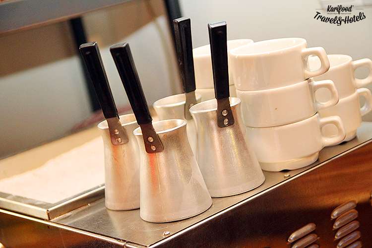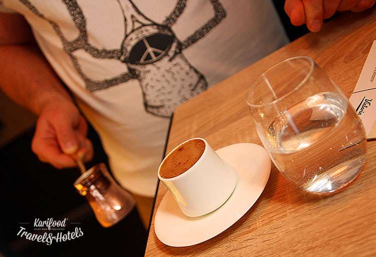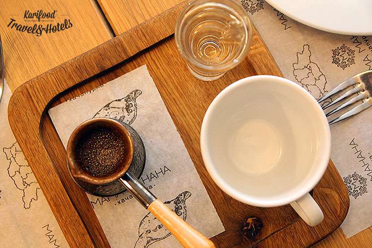В Мusafir готовят не только чёрный кофе, в заведении довольно обширное меню с джезвой: кофе с пряностями (с гвоздикой и лимоном), на молоке (его добавляют не перед подачей в сваренный кофе, а прямо на молоке и варят), с какао и корицей, ну, а при желании всегда можно попросить опционально микс любимых пряностей: например, кофе на молоке с корицей или гвоздикой, с какао и с лимоном.