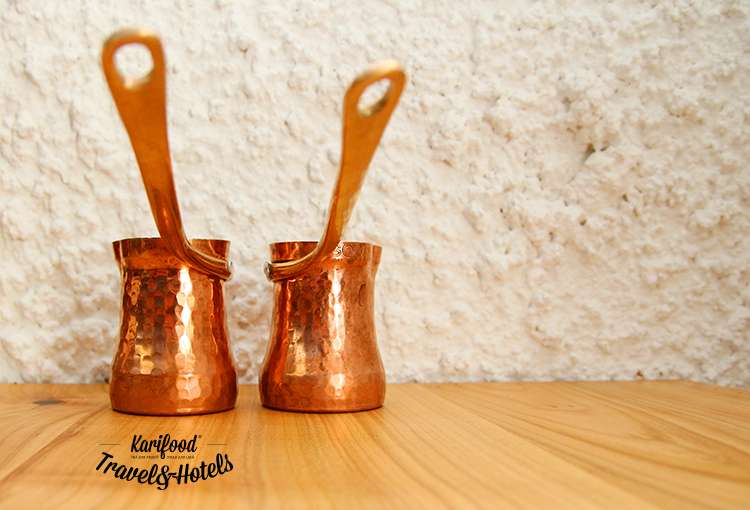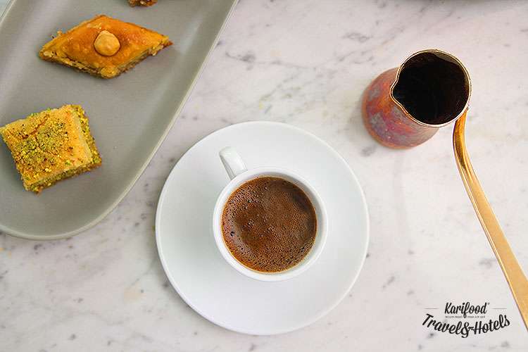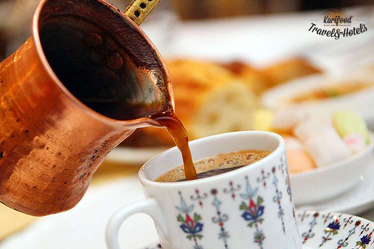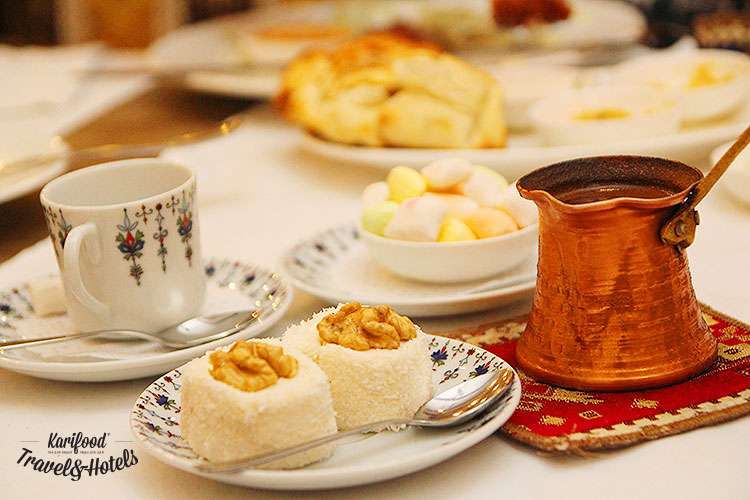 Къаве (кофе) варят на турецком молотом кофе Kurukahveci Mehmet Efendi, подают, надев на горячую ручку джезвы специальную полотняную «варежку», вместе с  блюдечком сахарных подушечкек.