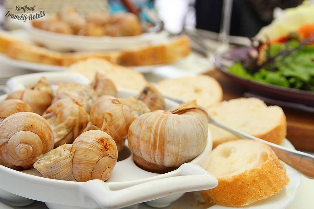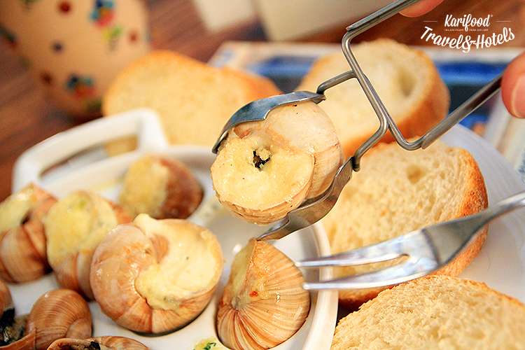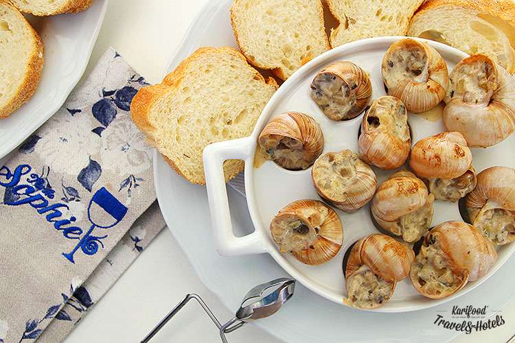 Горячие улитки подают с ломтиками багета, которыми нужно собрать и вымакать весь ароматный соус с эскарготьерки.