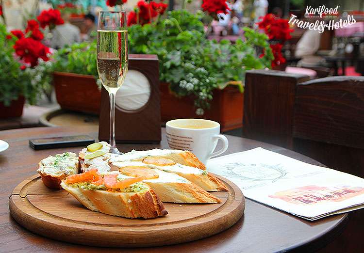 Не успеете опомниться, как вы уже сидите на открытой террасе с чашкой кофе, бокалом игристого и огромным подносом ломтиков багета с крученым салом, козьим сыром, острыми пикулями, форшмаком, икрой такой, икрой сякой.