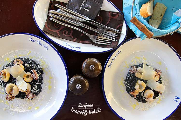 В Мушлях ризотто — чёрное, плотное, кремовое, сытное. Это гладкое блаженство с чернилами каракатицы хочется растянуть на целую вечность или, сбавив градус пафоса, просто попросить ещё одну порцию, едва доев первую.