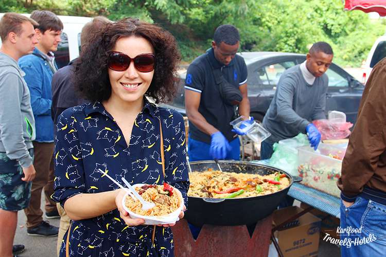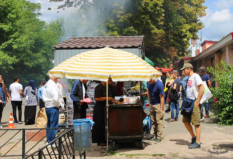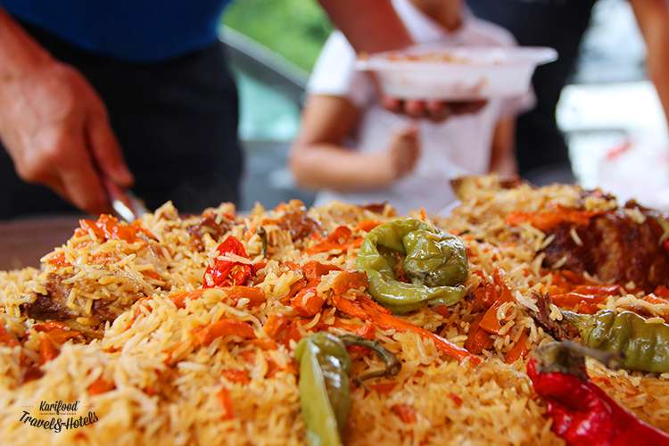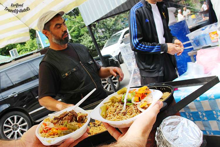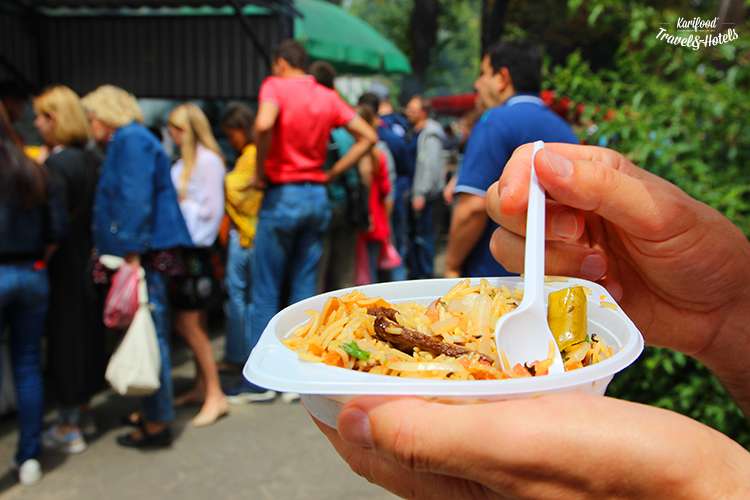 Сьогодні казани з пловом і мангали тягнуться уздовж кам’яного муру на кілька десятків метрів. Найбільше люду купчиться довкола балій із гарячим пловом, але й самоси, коржики з м’ясом і сиром розлітаються вмить.