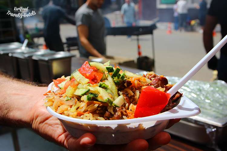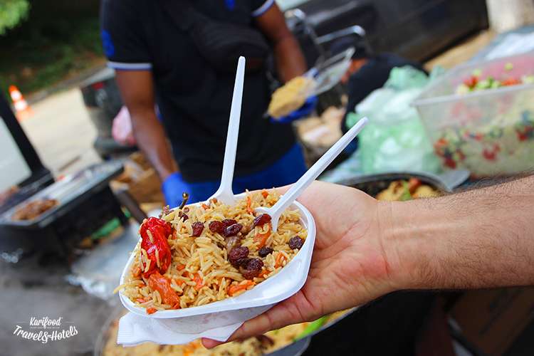 Халідова ятка — чи не найбільша. Тут можна поласувати і пловом, і кебабами, і м’ясом із шампурів, загорнутим в корижики, а ще купити айран і хумус із собою. Справа в тому, що це «ресторан на виїзді» — халяльний Family House заходиться неподалік, як раз на території Ісламського культурного центру, до стін якого тулиться мусульманський ринок їжі.