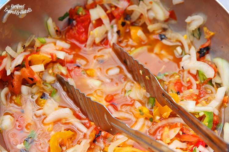 Під стінами уздовж ринку розставлені величезні порожні пакунки з-під вугілля, які замінюють кошики для сміття. Столиків лише кілька, тож люди пригощаються, тримаючи тарілки на руках, час від часу повертаючись до казанів за новою порцією.